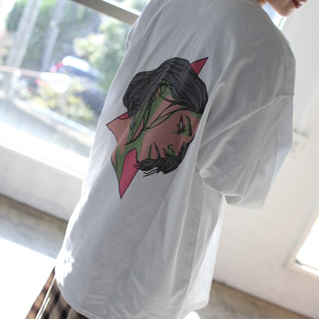 実際の日本人モデルをモチーフにデザインしたイラストを大きくバックプリントしたエッジの効いたデザインがこのアイテムの持ち味。